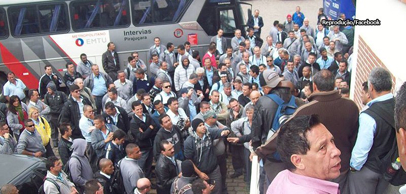 Motoristas e cobradores da Viação Pirajuçara na garagem à espera de donos da empresa para reunião