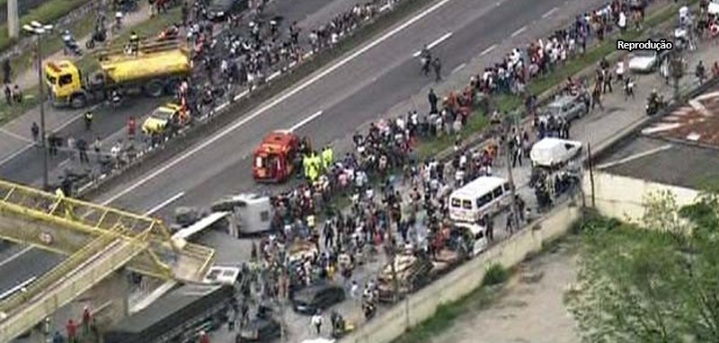Um caminhão bateu na passarela na rodovia Régis Bittencourt na altura do km 274, em Taboão da Serra, e derrubou parte da estrutura sobre a pista em direção a São Paulo, no fim da tarde desta segunda-feira, por volta das 17h15. O motorista do veículo, que tombou às margens da estrada, ficou ferido, e um pedestre também teria sido atingido. Helicóptero de resgate da Polícia Militar foi acionado, pousou na estrada e levou o condutor ao Hospital das Clínicas na capital. O tráfego está bloqueado nos dois sentidos (São Paulo e Curitiba), com centenas de populares no local.