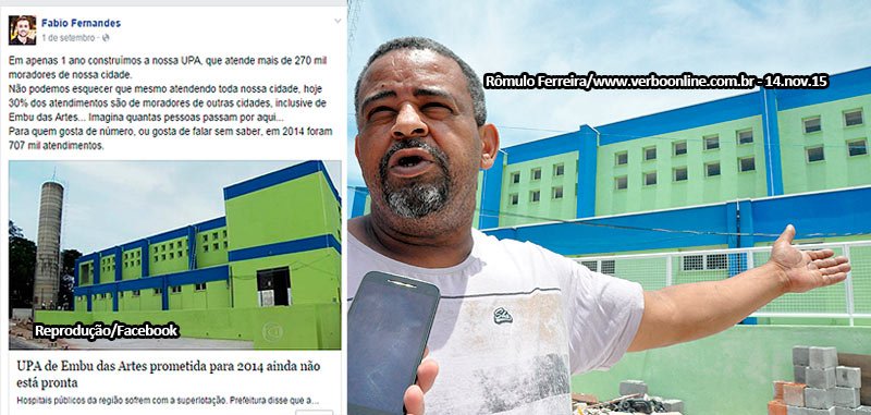 Fernando foi, porém, o primeiro a criticar que, enquanto construiu a UPA de Taboão em tempo recorde, em 2013, a de Embu, embora o PS seja concebido pelo governo federal do partido do prefeito de Embu (PT), estava longe de ser inaugurada. Aliás, ele usou o atraso em Embu para dizer que na região só Taboão tem UPA e justificar a sobrecarga na saúde da cidade. E o filho do prefeito, Fabio Fernandes, postou no Facebook que a UPA de Embu era uma obra parada.
