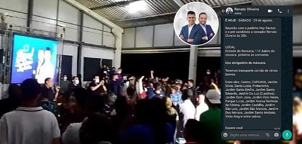 Na mensagem via rede social, Renato disse que os participantes iam contar com ônibus gratuito. “É HOJE – SÁBADO 29 DE AGOSTO. Reunião com o prefeito Ney Santos e o pré-candidato a vereador Renato Oliveira às 20h. LOCAL: Estrada do Ressaca, 110, próximo ao convento. Uso obrigatório de máscara. Teremos transporte saindo de vários bairros [cita 18 locais], entre outros. Espero você”, disparou. Apesar da pandemia, o ato teve grande aglomeração.