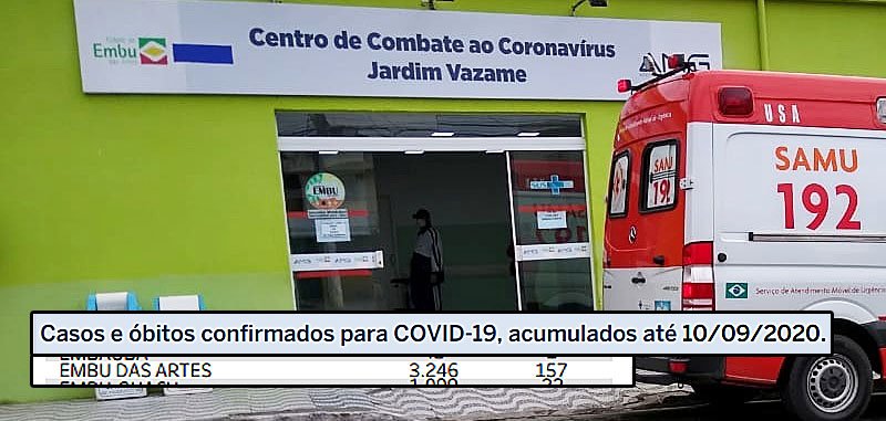 Embu das Artes passou a registrar 157 mortes pela covid-19, notificados nesta quinta-feira (10), oito casos fatais a mais em menos de uma semana. Na sexta-feira (4), contava 149 vítimas. O município fechou a semana passada com sete óbitos pelo novo coronavírus. Nestes últimos seis dias, relata seis. Embu tem 3.246 casos da doença desde o início da pandemia, 42 novos infectados desde domingo – nos sete dias anteriores, foram 191 a mais.