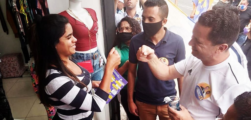 Nóbrega (MDB) fala com eleitora no Pirajuçara; prefeiturável promete erguer 1º CEU de Taboão no 'elefante branco' da Arena Multiuso | Adilson Oliveira/Verbo