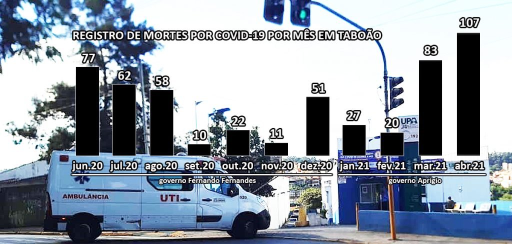 Em “pesadelo” sem fim para a população de Taboão da Serra, sob o governo Aprígio (Podemos), a Secretaria Municipal de Saúde confirmou nesta segunda-feira (26) mais nove mortes por covid-19, o segundo registro mais alto em 24 horas desde o início da pandemia – que já tinha ocorrido no dia 16. Taboão passa a somar 593 vítimas. No mês já mais letal, Taboão notifica em abril 107 óbitos, 29% a mais do que em março, antes o mais mortal.