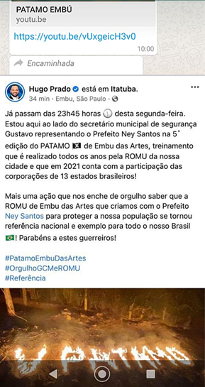 Na noite de ontem, Hugo expôs no Facebook que dezenas de GCMs estavam fora das ruas. “Já passam das 23h45 horas desta segunda-feira. Estou aqui ao lado do secretário municipal de Segurança, Gustavo, representando o prefeito Ney Santos na 5ª edição do Patamo de Embu das Artes, treinamento que é realizado todos os anos pela Romu da nossa cidade e que em 2021 conta com a participação das corporações de 13 estados brasileiros”, postou.
