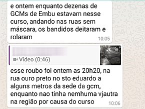 Após vídeos postados em outras redes sociais exporem GCMs no centro de formação durante o dia e marchando em cantoria em rua do Itatuba à noite, um casal foi assaltado, no Santo Eduardo. Imagens de câmera de segurança mostram o homem e a mulher ao chegar em casa de moto e dois criminosos logo atrás, também de moto. Armado, um revira os bolsos do rapaz e o assalta. O outro leva o capacete. A moça, que abre o portão, fica sem reação.