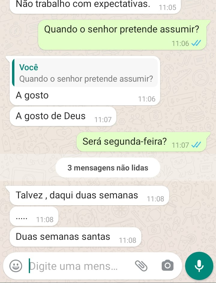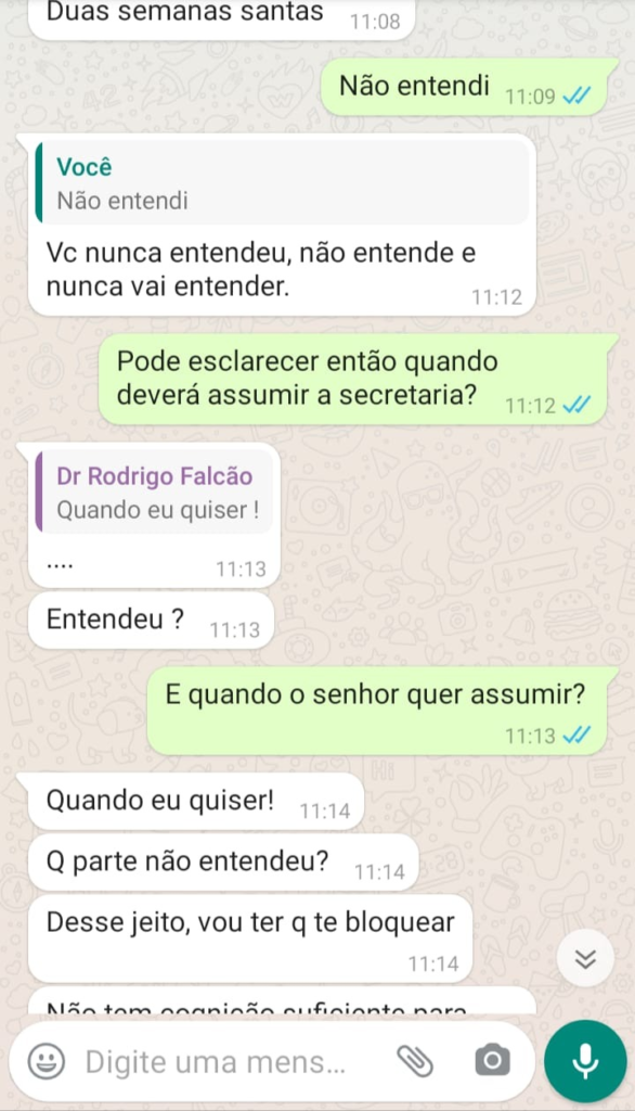 “Quando eu quiser assumir, você não será o portador da notícia […]. Eles merecem que a notícia tenham uma fonte segura”, falou Falcão. A reportagem disse que ia informar a posição. “Duvido que você colocará esse diálogo de hoje na íntegra. Não faz parte do seu caráter”, disse. O VERBO noticiou que Falcão se envolveu em polêmicas ao ser acusado de assédio moral por uma GCM feminina e ao autorizar um GCM a se vacinar contra covid-19 fora da vez.