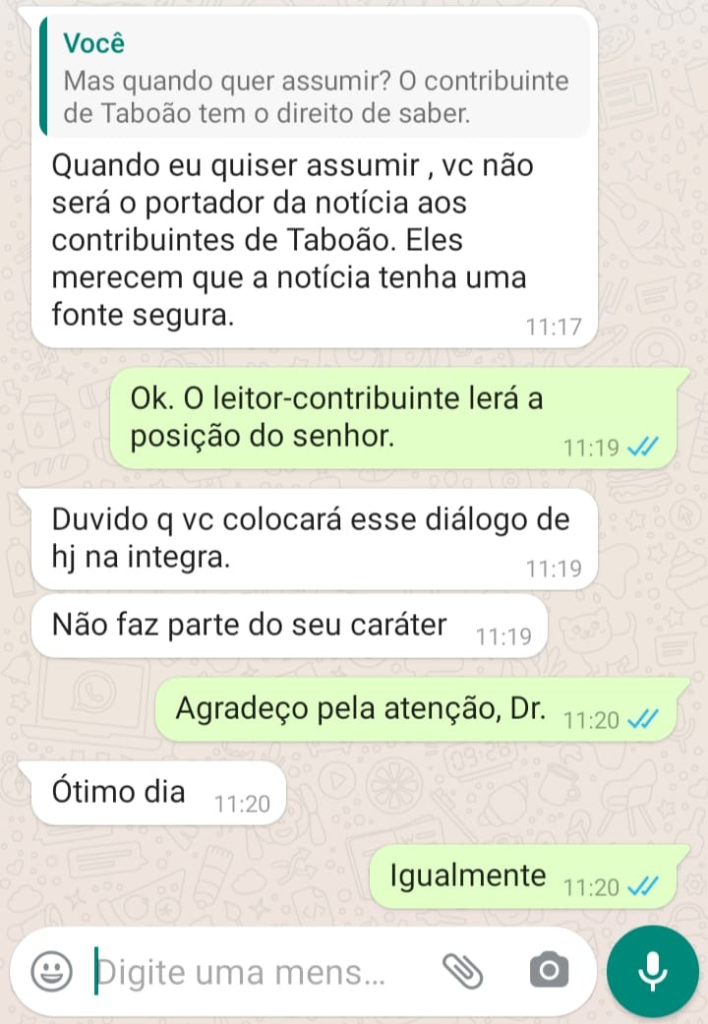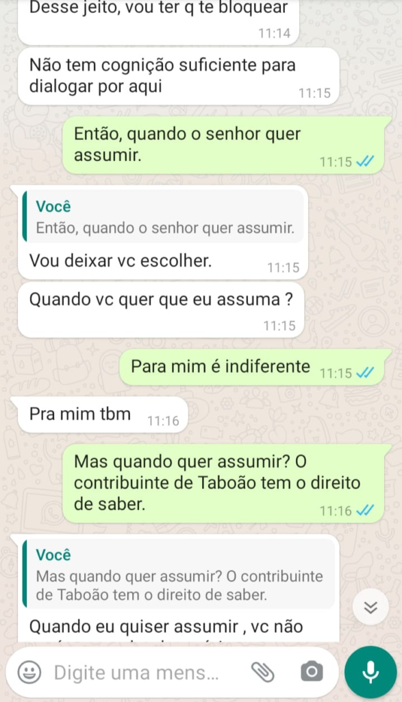 Menos de 15 dias depois de este portal noticiar que Falcão ia comandar a secretaria “em breve”, a liberação é concedida. Questionado quando assumirá oficialmente, ele foi irônico e agressivo com o VERBO. “Quando eu quiser!”, disse. Indagado então quando desejava assumir, ele falou: “Não tem cognição suficiente para dialogar por aqui”. Este veículo disse a Falcão que os contribuintes de Taboão têm o direito de saber sobre a nomeação.