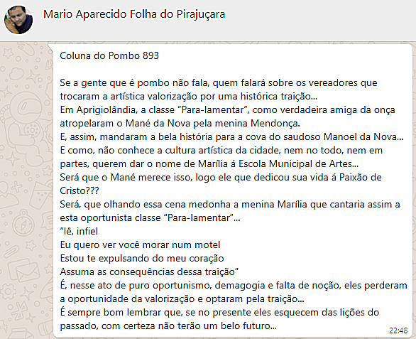 Aparecido recorreu ao grande sucesso de Marília, “Infiel”, e ao tema da canção, “traição”, para reprovar a aprovação do projeto pelos vereadores. “É, nesse ato de puro oportunismo, demagogia e falta de noção, eles perderam a oportunidade da valorização e optaram pela traição”, escreveu, em outro trecho. O VERBO procurou Rodney para comentar a crítica. Ele não atendeu ligação e não respondeu a mensagem. O projeto vai para sanção do prefeito.