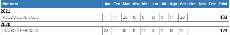 O roubo de veículos em Embu aumentou 8%. Passou de 123 de janeiro a setembro de 2020 para 133 registros nos primeiros nove meses deste ano. O tipo de delito teve duas quedas seguidas, mas a última comparação indicou tendência de alta, que agora se confirma – sempre em relação ao período analisado, o município registrou em 2019 redução expressiva de 42% (de 245 para 141 roubos) e em 2020, 13% a menos (de 141 para 133 ocorrências).