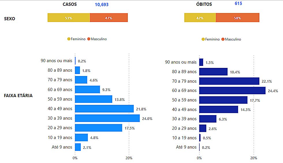 Os dados são da Secretaria Estadual de Saúde. Convertidos os percentuais, Embu registra a morte por covid-19 de 357 homens e 258 mulheres: 60 a 69 anos (150 óbitos), 70 a 79 (136), 50 a 59 (109), 40 a 49 (88), 80 a 89 (64), 30 a 39 (39), 20 a 29 (16), 90 anos ou mais (9), 10 a 19 (3), 0 a 9 (1) – sem transparência, a gestão Ney Santos (Republicanos) não divulga sexo e faixas etárias. Embu tem taxa de mortalidade pela doença de 2,20 mortes por mil habitantes.