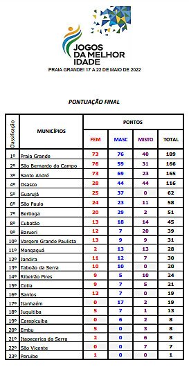 VEJA A PONTUAÇÃO FINAL DAS CIDADES-PARTICIPANTES DO 24º JOGOS REGIONAIS DA MELHOR IDADE