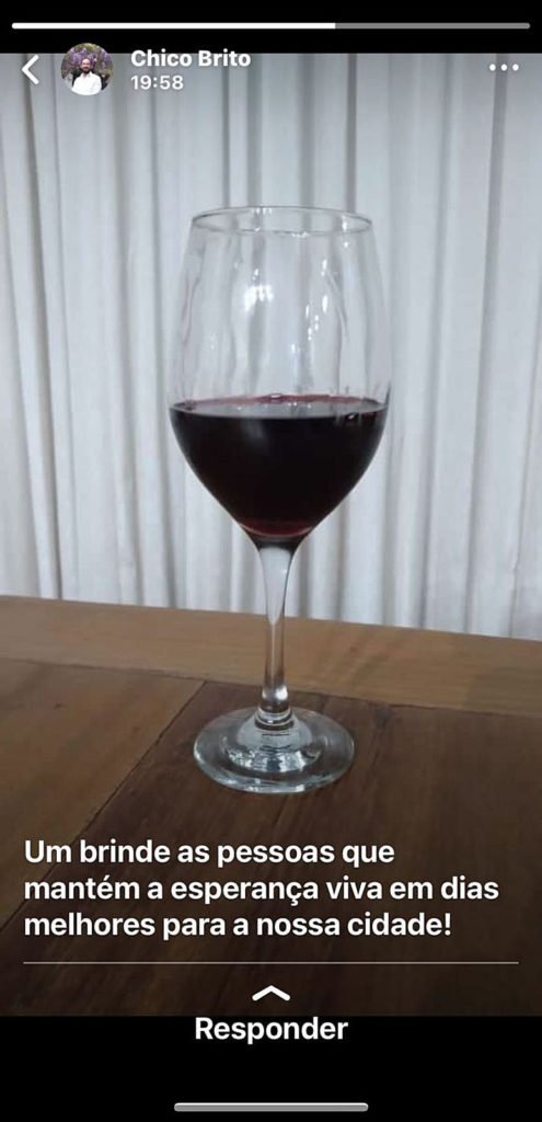 Depois, Ney “filosofou”. “Quando a gente deseja o mal para as pessoas, o mal vem para a gente a jato. Ele é uma pessoa que a gente sempre teve uma boa relação, eu não esperava aquela comemoração que ele fez no dia do nosso julgamento”, disse. Ele mandou a foto da taça com a frase de Chico – este portal obteve a imagem. Com erros de português, o texto diz: “Um brinde as pessoas que mantém a esperança viva em dias melhores para a nossa cidade!”