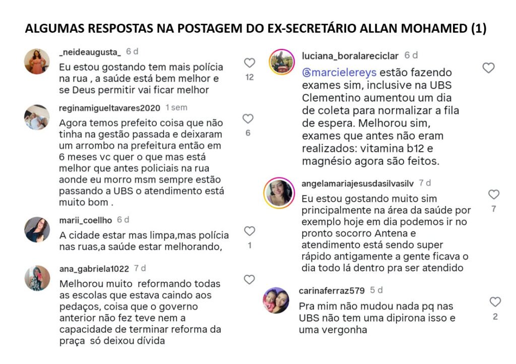 EU TE CONHEÇO 3 Entre as avaliações de melhora, Neide Augusta diz: “Tem mais polícia na rua, a saúde está bem melhor e, se Deus permitir, vai ficar melhor”. Regina Tavares fala: “Deixaram um rombo na prefeitura, então em 6 meses você quer o quê? Mas está melhor que antes: policiais na rua, onde eu moro mesmo sempre estão passando; a UBS, o atendimento está muito bom”. Mari Coelho declara: “A cidade está mais limpa, mais polícia nas ruas, a saúde está melhorando”.