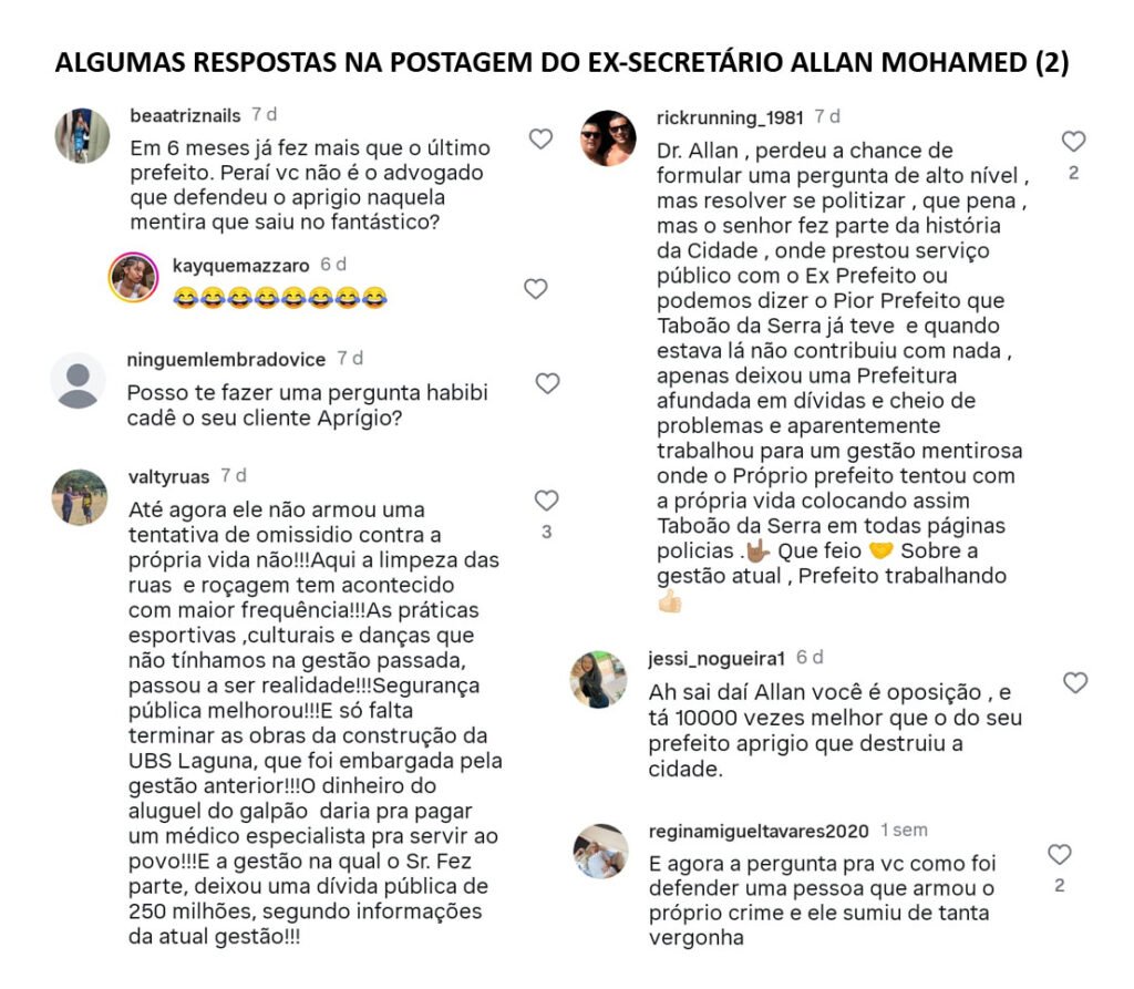 Mesmo após integrar o governo Aprígio (Podemos), apontado como o pior da história de Taboão da Serra, que não fez nem o básico – não construiu sequer uma creche e uma escola e alugou um galpão para abrir a UBS Laguna, e apenas no último ano de mandato, ao não terminar obra iniciada por “picuinha política”, além de deixar dívida de R$ 261 milhões -, o ex-secretário Allan Mohamed publicou um vídeo na quarta-feira (25) para criticar a gestão Engenheiro Daniel (União).