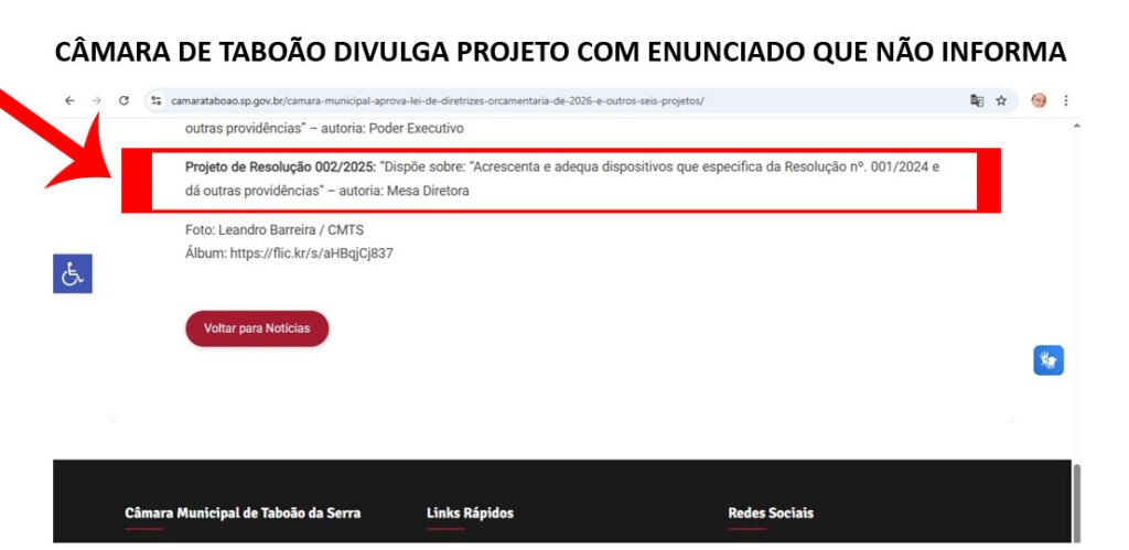 A ESCONDER A Câmara de Taboão aprovou no dia 24 este projeto: “Acrescenta e adequa dispositivos que especifica da Resolução nº 001/2024 e dá outras providências”. O leitor entendeu? E a Câmara pôs no site assim! (foto). Procurado pela coluna, o presidente Carlinhos do Leme (MDB) não atendeu ligação e não explicou por texto o que era aquilo. O projeto autoriza sessão online no recesso. Os vereadores não querem ir à Câmara neste mês (“férias”) e nem que ninguém saiba.