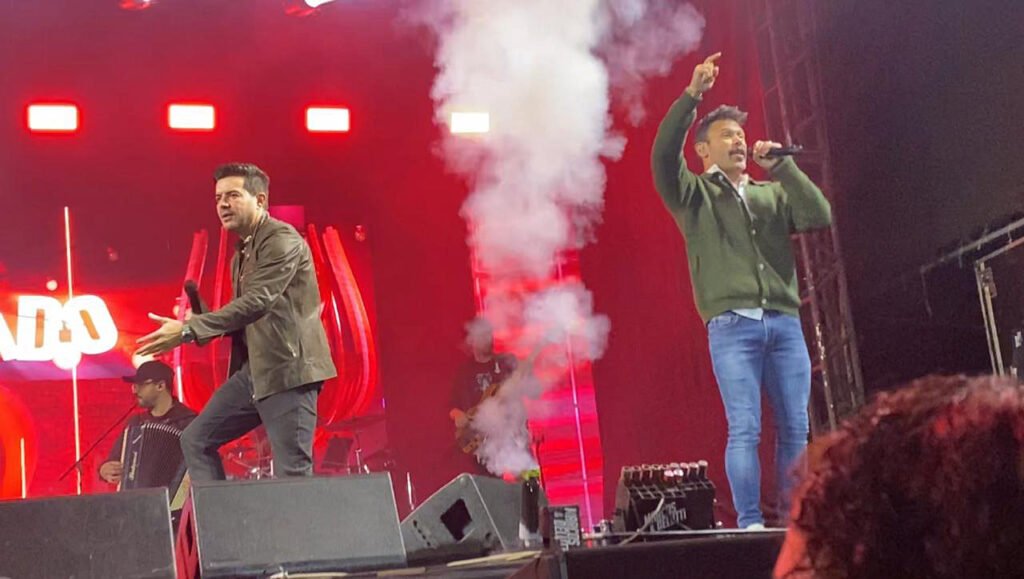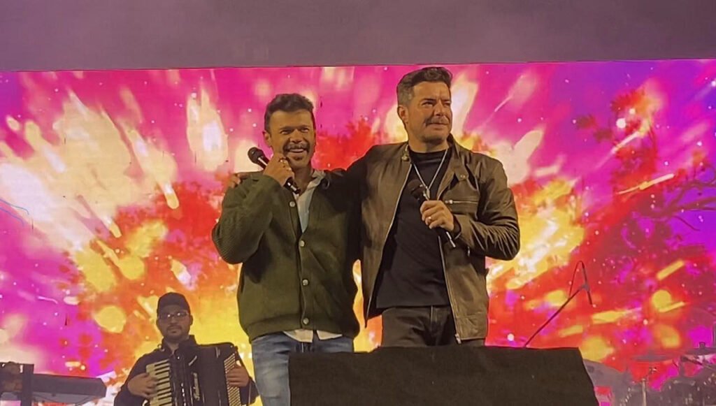 “Nós fomos anunciados há tão pouco tempo e mesmo assim, neste domingão à noite, neste baita frio, vocês saíram de casa e vieram aqui curtir com a gente”, disse Marcos na abertura. “Muito obrigado por esse carinho, por essa energia, a gente promete retribuir, fazendo com que seja uma noite inesquecível, que vocês se divirtam muito. A gente vai pegar fogo”, acrescentou. Belutti contou que no passado se apresentou na região. “Estou me sentindo em casa hoje aqui”, disse.