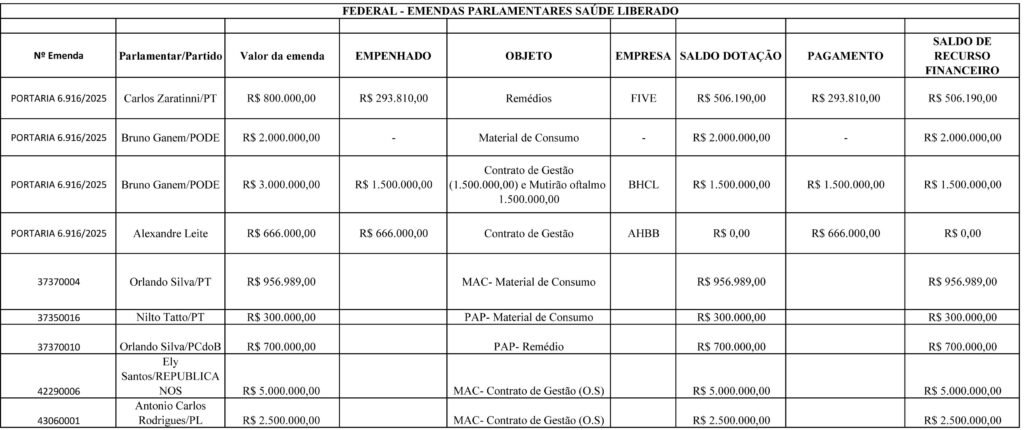 Os cerca de R$ 10,9 milhões a mais recebidos pela prefeitura provêm de oito emendas de seis deputados. Dois congressistas destinaram duas emendas em separado. Um foi Bruno Ganem (Podemos), que enviou o maior aporte, de R$ 5 milhões, em valores somados. O outro foi Orlando Silva (PC do B), que encaminhou, também somados, R$ 1.656.989,00. Globalmente, o terceiro deputado que mandou mais recurso, porém, foi Antonio Carlos Rodrigues (PL) – R$ 2,5 milhões.