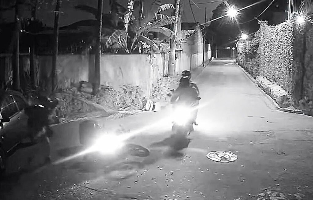 Um motoqueiro foi perseguido e assaltado por dois homens também em uma motocicleta, ambos armados, na madrugada de sábado (13) na Vila Iasi, em Taboão da Serra. Uma câmera de vigilância flagrou o crime. Nas imagens, o trabalhador – em moto com baú -, sem ter como escapar, deita no chão. O piloto rouba os pertences da vítima no solo. O garupa sobe na moto, mas não consegue dar partida. O comparsa obriga a vítima a se levantar para destravar.
