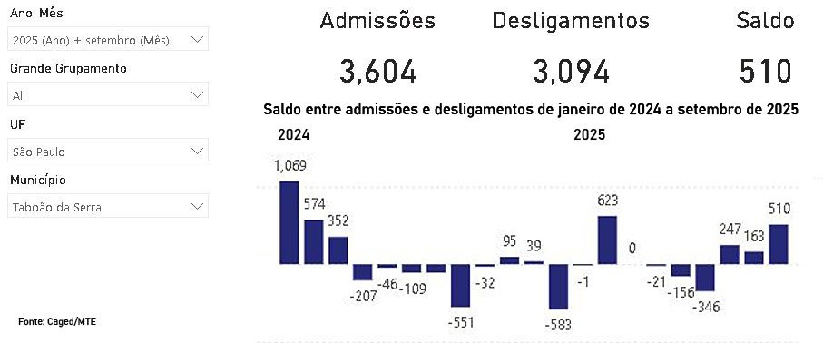 Os dados são do Cadastro Geral de Empregados e Desempregados, o Caged, divulgados na quinta-feira (30) pelo Ministério do Trabalho e Emprego. Taboão registrou em setembro 3.094 demissões, mas teve 3.604 admissões de trabalhadores – criou 510 vagas. A cidade obteve desempenho muito bom, já que no mesmo mês de 2024 amargou 32 vagas negativas, ou seja, somou mais desligamentos (3.198) do que contratações (3.166) – nenhuma das três cidades locais “negativou”.