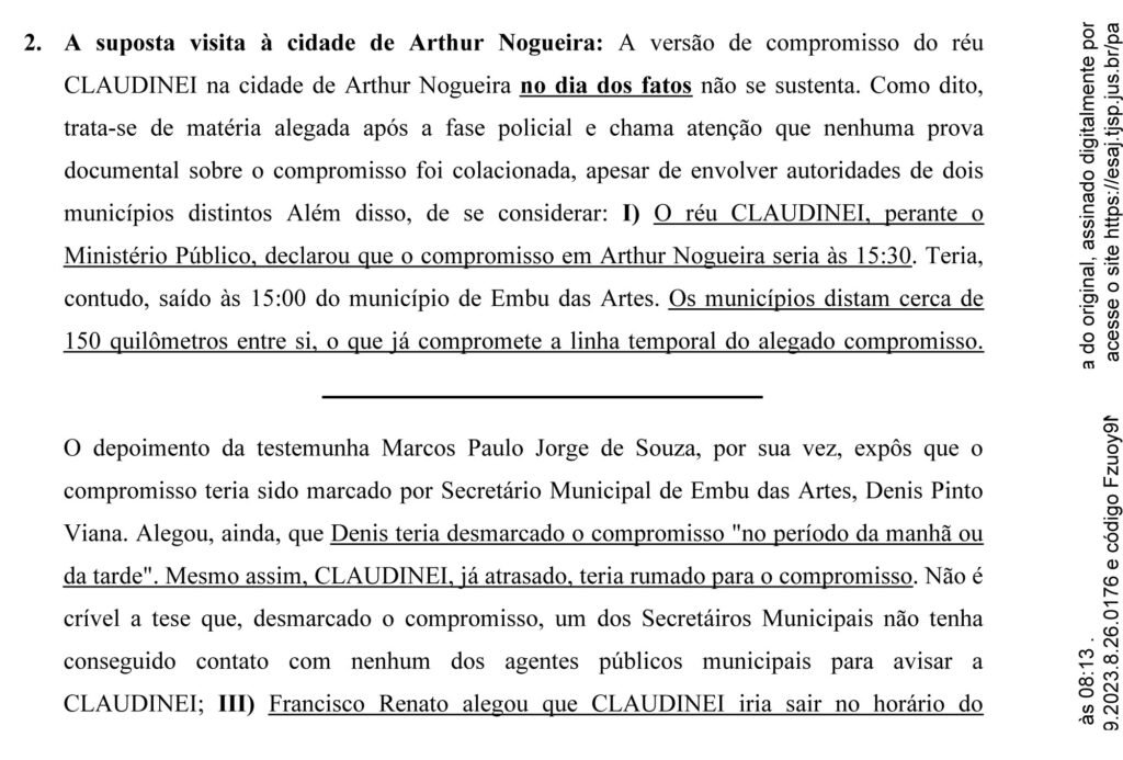 A juíza vai além, observa que Ney declarou que o compromisso em Artur Nogueira seria às 15h30, contudo, teria saído de Embu às 15h. “Os municípios distam cerca de 150 quilômetros entre si, o que já compromete a linha temporal do alegado compromisso [grifo]”, diz. Ao citar que uma autoridade de Artur Nogueira informou que o secretário Denis teria desmarcado a agenda, ela afirma que “não é crível” que nenhum agente municipal tenha conseguido avisar Ney.