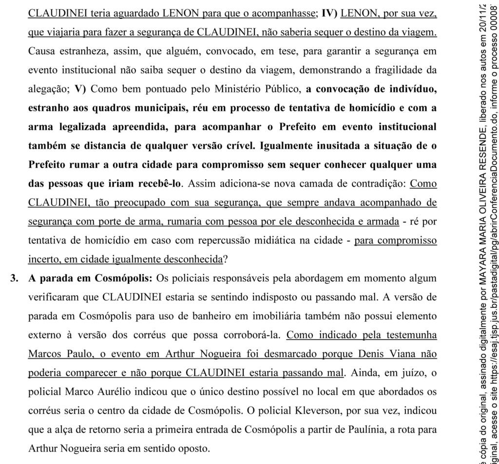 Ela diz também que os PMs não verificaram que Ney estaria passando mal, e atestaram que o então prefeito e Lenon estavam em local onde o único destino possível seria Cosmópolis, e não Artur Nogueira, ao observar que Ney também não conseguiu provar ter estado em uma empresa de compra/venda de imóveis. “A versão de parada em Cosmópolis para uso de banheiro em imobiliária também não possui elemento externo à versão dos corréus que possa corroborá-la”, diz.