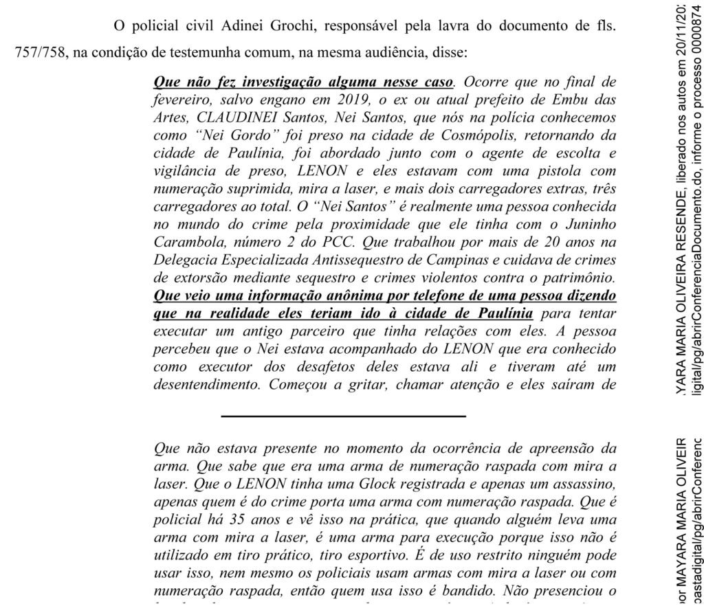 O processo ainda traz fala de um policial da Delegacia Antissequestro da região que, após citar que Ney “foi preso na cidade de Cosmópolis, retornando da cidade de Paulínia”, diz que na manhã seguinte ao da abordagem atendeu um telefonema anônimo em que um homem disse, sobre Ney e Lenon, “que na realidade eles teriam ido à cidade de Paulínia para tentar executar um antigo parceiro que tinha relações com eles”, ao chamar Lenon como “executor dos desafetos deles”.