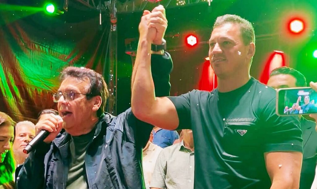 Fernando Fernandes com Engenheiro Daniel na cerimônia de abertura do 'Natal Iluminado', ao elogiar o prefeito pelo resgate da tradicional celebração e sobre a gestão | Divulgação