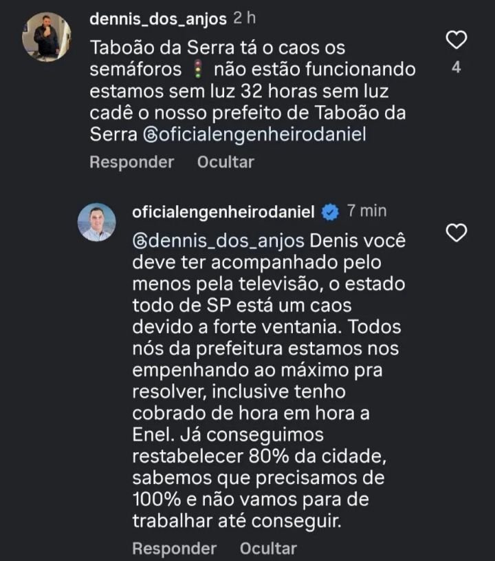 “[Morador] Dennis você deve ter acompanhado, pelo menos pela televisão, [que] o estado todo de SP está um caos devido a forte ventania. Todos nós da prefeitura estamos nos emprenhando ao máximo pra resolver, inclusive tenho cobrado de hora em hora a Enel. Já conseguimos restabelecer 80% da cidade, sabemos que precisamos de 100% e não vamos ‘para’ [parar] de trabalhar até conseguir”, respondeu Engenheiro Daniel, na própria postagem.
