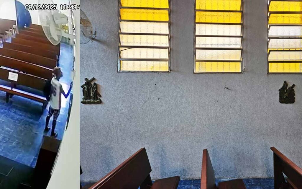 A Paróquia Santa Tereza e São João da Cruz teve furtados dois cálices de ouro e prata, um suporte de missal (livro de orações da missa) e duas peças de via-sacra (representações do calvário de Cristo) de bronze. Em data de festa aos católicos, Dia da Imaculada Conceição, a igreja foi aberta para os fiéis rezarem, mas outra porta teria ficado acessível. Foi por onde o ladrão entrou. Como as imagens mostram, ele acessou o local e o comparsa esperou na entrada da igreja.