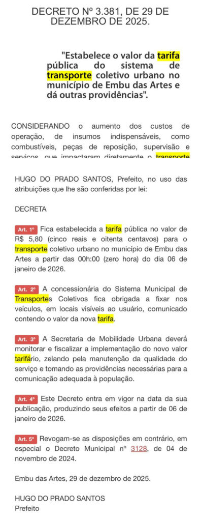 VEJA DECRETO DO PREFEITO HUGO PRADO QUE AUMENTA TARIFA DE ÔNIBUS DE EMBU PARA R$ 5,80