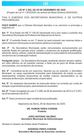Fonte: “Imprensa Oficial” de Itapecerica da Serra edição MCCXX [1.220] – 29 de dezembro de 2025