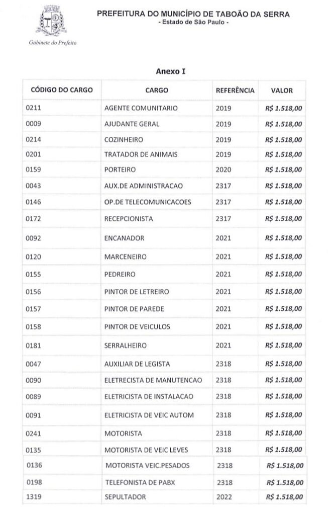 CATEGORIAS DE SERVIDORES DE TABOÃO DA SERRA QUE TERÃO REAJUSTE PARA R$ 1.621 COM O NOVO SALÁRIO MÍNIMO
