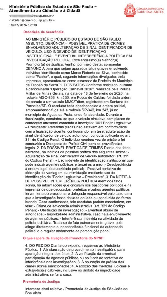 Na denúncia, Abidan justifica que “há indícios” de que pastor Marco – com atuação política em Embu – cometeu os crimes de adulteração de placa veicular e uso indevido de identificação funcional, ou seja, tentou se passar pelo presidente da Câmara embuense, o que “pode induzir agentes públicos e terceiros a erro”, mas também como “possível tentativa de obtenção de vantagem ou intimidação mediante o uso de identificação de ‘Poder Legislativo – Presidente'”.